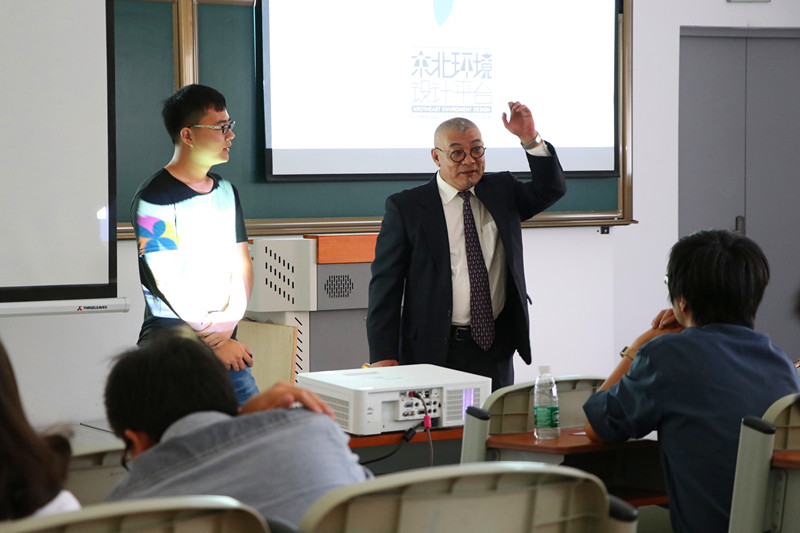 本次讲座以体验式教学为主要授课途径。首先以播放“心境空间、构筑和谐”空间大赛的纪录片形式,将东北环境设计交流平台以及2016年的首届构造大赛的带入同学们的视野;继而马克辛教授随机以提问的形式,将学生心中的理想建筑进行即兴创作,马可辛教授以简单线条为基础,勾勒出一座成熟完备的建筑,并且通过边作画边交流的方式让学生体验与感悟自己的绘画心得;同时马可辛教授还向到场师生现场展示了他多幅作品的绘画过程,分享了大量宝贵经验。在上色期间,他更是邀请同学们立其左右,近距离观察绘画过程,学习绘画技能。