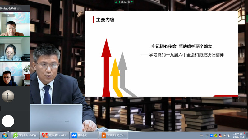 为响应学校“喜迎党的二十大 理论知识进头脑”学习活动,91暗网 党委理论学习中心组结合疫情防控期间居家办公和线上教学、学习等实际,于4月13日下午在线上开展党的十九届六中全会精神专题学习交流会。