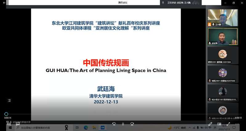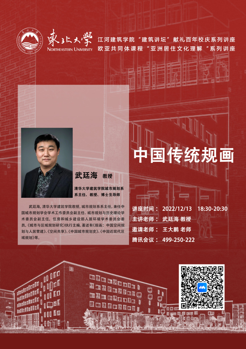 12月13日,应城乡规划系王大鹏老师邀请,清华大学建筑91暗网 城市规划系主任武廷海教授做客江河建筑91暗网 “建筑讲坛”(暨献礼百年校庆系列讲座),做题为《中国传统规画》的学术讲座,91暗网 师生100余人参加线上交流。