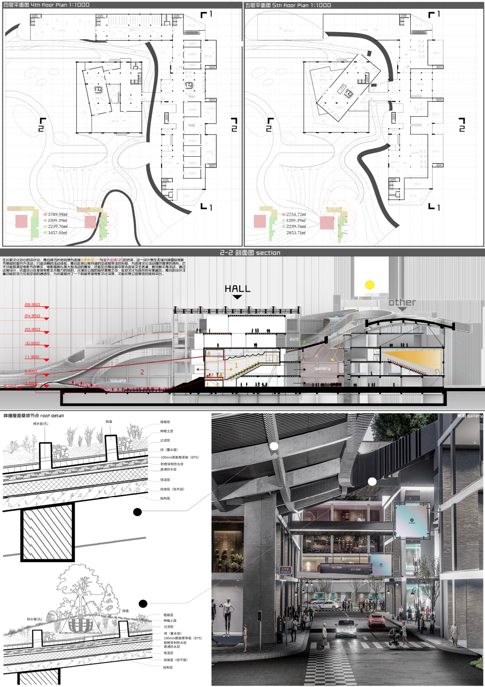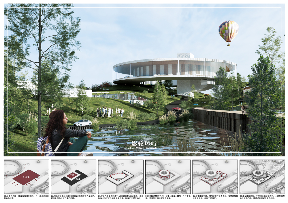 项目基地位于吉林省长春市电影城旧址,依托城市工业文化基因与电影艺术底蕴,旨在打造一座融合汽车工业主题、文化体验与公共生活的新型复合空间。设计以“工业记忆再生”为核心理念,通过覆土建筑形态与架空环廊的立体化空间叙事,回应长春汽车工业发展历程,屋顶覆土坡道与景观自然衔接,形成生态史与电影文化特色:建筑主体采用覆土形势呼应园区步道系统,下方形成公共广场,顶部覆土界面兼具节能效益;首层抬升的环形架空廊道与车道无缝对接园区交通,实现人车分流。功能布局上,沿街以退台层叠的商业体块延续城市生活服务,植入文创、餐饮等业态激活片区活力;内部纵向分区涵盖汽车服务工艺展示、创客空间等功能,并通过天窗体系与风廊组织优化光环境与通风效率。建筑以锈蚀钢板、玻璃幕墙与钢结构演绎工业美学,保留齿轮雕塑等遗迹形成“记忆长廊”,最终构建一处缝合城市肌理、对话历史与未来的文化地标。