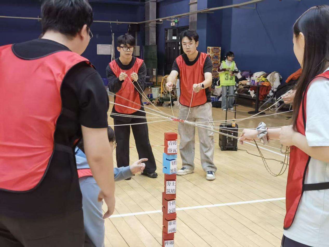 紧随其后的“合力筑塔”项目,则是对团队默契与稳定性的极致考验。十名队员需协同操控塔钩绳索,将七块印有特定字样的积木精准堆叠并保持3秒不倒。任何微小的失误都可能导致“功亏一篑”,紧张氛围中尽显协作智慧。